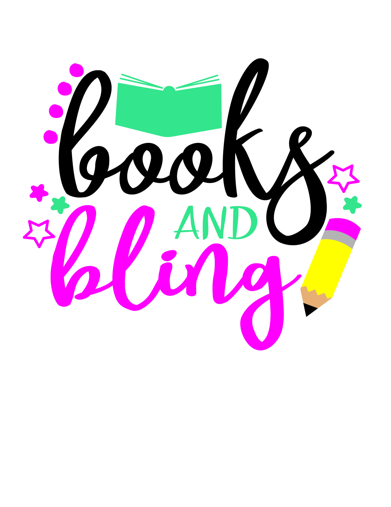 The typography mixes elegant script lettering with bold modern elements creating a lively and upbeat composition. The word “books” appears in large black cursive letters giving it a stylish handwritten look while “bling” is written in an eyecatching bright pink script that adds a sense of fun and sparkle.