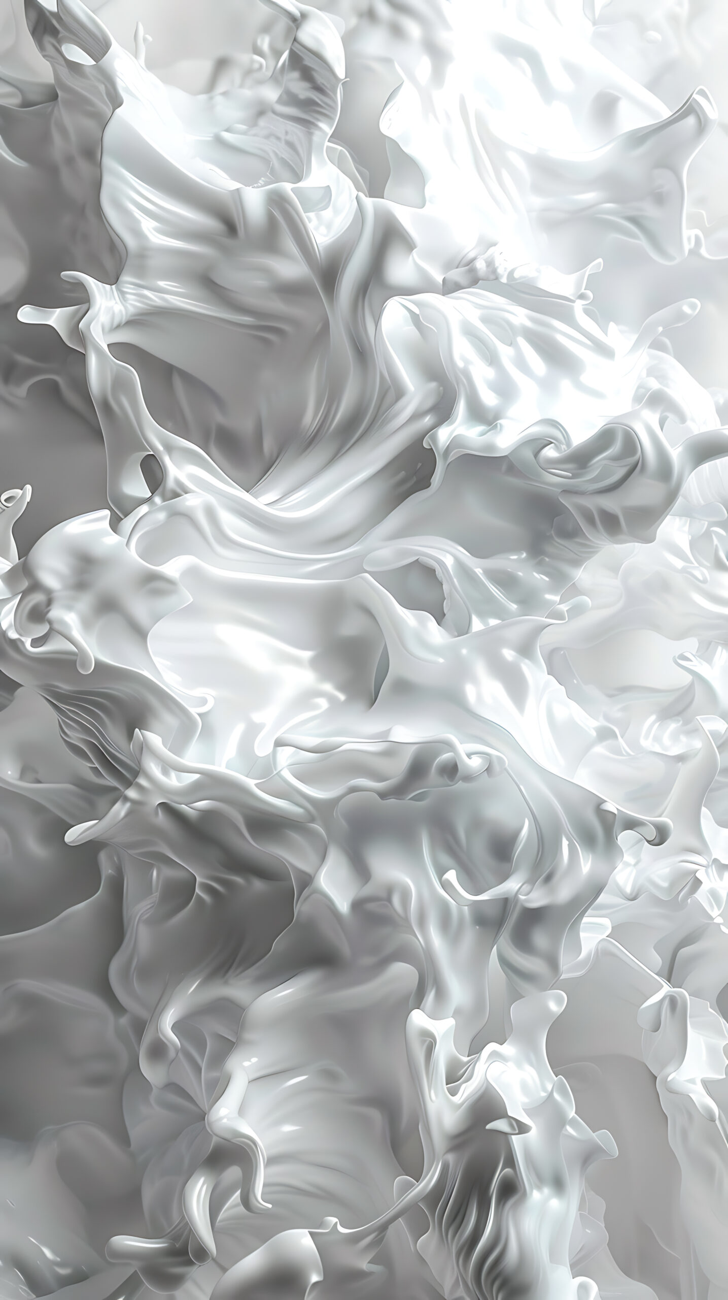 This image features an abstract highdetail composition resembling swirling fluid white material frozen in motion. The entire scene is dominated by glossy liquidlike textures that create the illusion of silky waves poured cream or sculpted molten satin.